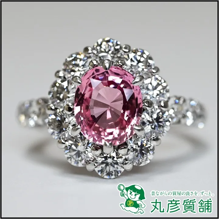 こちらの宝石はルビーほどの赤色はなく、鮮やかなピンク色が人気のピンクサファイアとなります。それを取り巻く1.9キャラットのダイヤモンドは、質の良いグレードの高い宝石が使われています。
